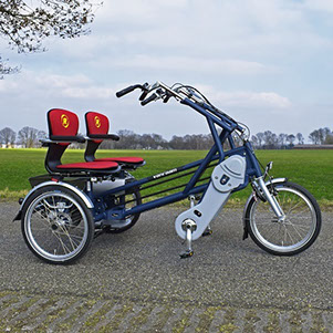 The Fun 2 Go is a special needs side by side trike, or double rider cycle, in which the users sit beside each other. One person steers, both can pedal. The two persons have a good view and can communicate well with each other due to the seats being next to each other.